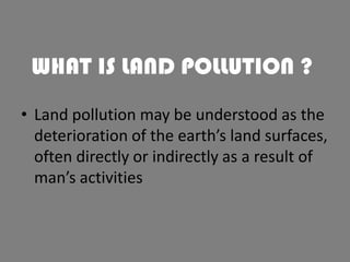 This document discusses land and soil pollution. It outlines various causes of land pollution including deforestation, overuse of pesticides and fertilizers, desertification, mining, waste disposal, and land conversion. Specific causes discussed in more detail include soil pollution from destruction of the top soil layer, inefficient use of land leading to shortage and deforestation, and overcrowded landfills. The effects of land pollution include impacts on climate through loss of forest cover, extinction of species due to habitat loss, bioaccumulation of toxins in the food chain, and reduced biodiversity. Preventative measures mentioned include reducing toxic waste, recycling waste materials, using organic products, growing more trees, and proper waste management.