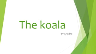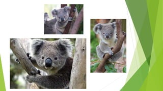 Koalas are marsupial mammals native to eastern Australia, characterized by their herbivorous diet primarily consisting of eucalyptus leaves. They are nocturnal, sleep for 18 to 22 hours daily, and have a unique reproductive process, with joeys being born just 2 cm long. Koalas typically live about ten years and measure around 76 cm, with fur varying from light grey to brown.