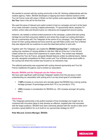 Škoda launched a campaign centered on cycling to improve brand perception, leveraging its heritage as a bike manufacturer and sponsor of cycling events, particularly the Tour de France. The campaign involved creating a mapping tool that allowed UK cyclists to experience sections of the Tour de France, along with a partnership with The Telegraph to enhance engagement. Results showed a significant increase in brand consideration among readers, with a 55% increase in consideration and a 140% increase in recognition of Škoda's cycling heritage.