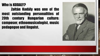 Zoltán Kodály was a 20th century Hungarian composer, ethnomusicologist, music pedagogue and linguist who developed an internationally recognized concept of music education. His method is based on teaching children music through solfege, sight singing, dictation and writing music using a progressive repertoire of Hungarian folk songs and exercises. Kodály played a prominent role in Hungarian public life and politics through his involvement in numerous boards and committees, and had influential connections with musicians, artists, scholars and politicians.