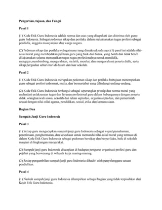 Kode etik guru Indonesia memberikan pedoman bagi guru dalam melaksanakan tugas profesional dan berinteraksi dengan berbagai pihak. Dokumen ini menjelaskan nilai-nilai dasar, sumpah/janji guru, dan hubungan guru dengan peserta didik, orang tua, masyarakat, sekolah, dan profesi secara umum.