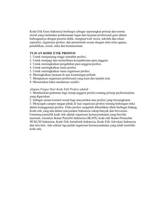 Kode etik guru adalah norma dan aturan profesional yang menjelaskan perilaku baik dan buruk dalam pendidikan untuk melindungi integritas profesi. Kode ini berfungsi sebagai pedoman bagi guru dalam menjalankan tugas mereka, meningkatkan martabat profesi, dan menjaga kesejahteraan anggota. Ketaatan terhadap kode etik bukan karena paksaan, melainkan sebagai komitmen pribadi untuk menjaga profesionalisme dan nilai moral dalam interaksi dengan siswa dan masyarakat.