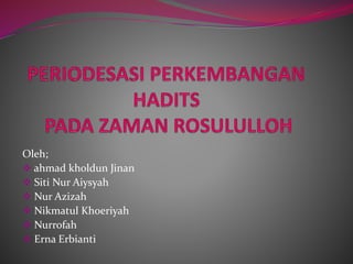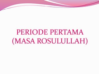 Dokumen ini membahas periode pertama penulisan hadis, yaitu masa Nabi Muhammad. Awalnya Nabi melarang penulisan hadis karena khawatir bercampur dengan Al Quran, namun kemudian diperbolehkan. Dokumen ini juga menjelaskan proses awal periwayatan hadis langsung dari Nabi kepada sahabat.