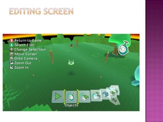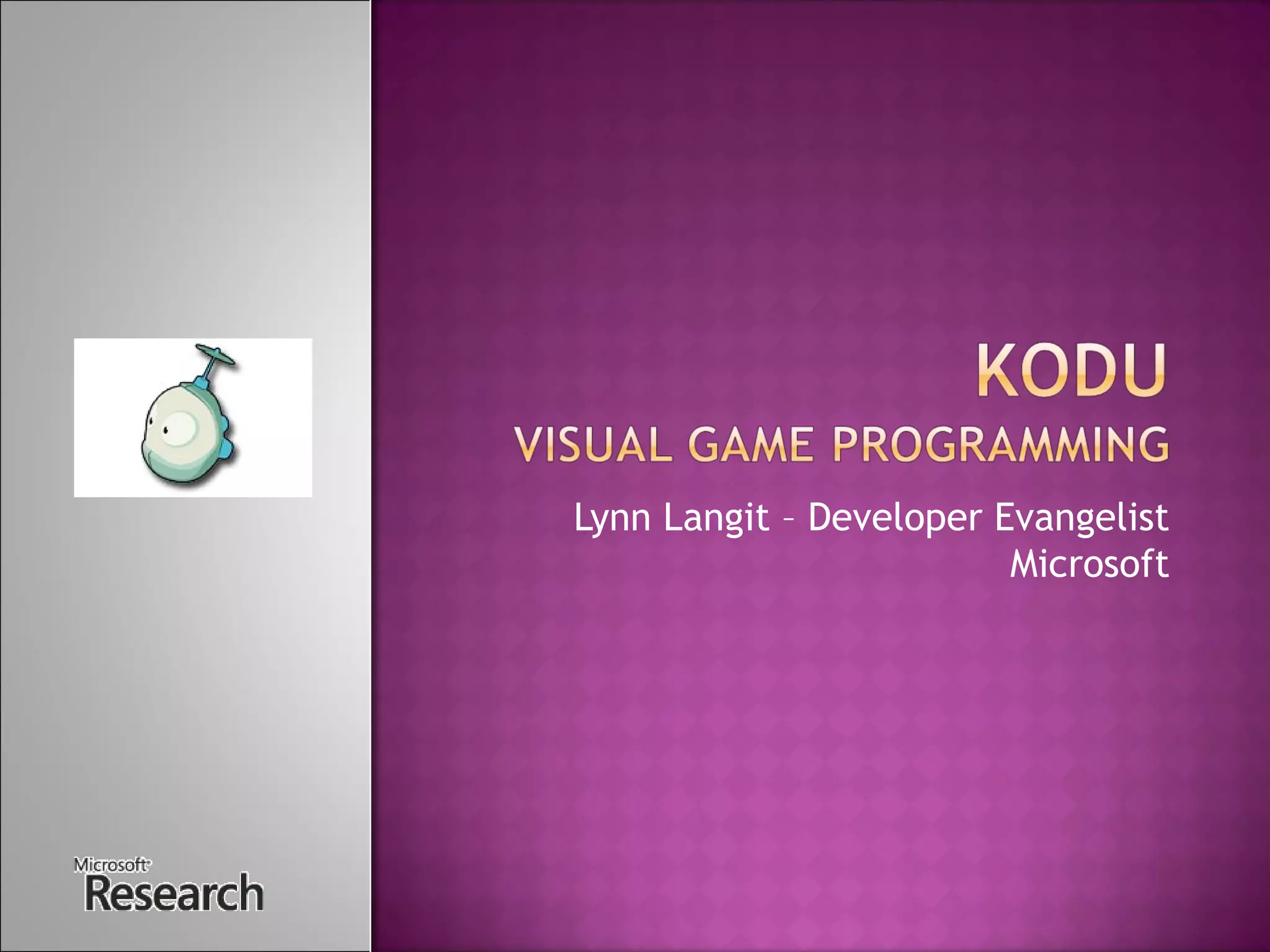 Kodu is a game development tool that allows users to create and play their own games with minimal instructions or manual. It introduces basic programming concepts through objects, properties, and methods. Users can navigate the interface using the Xbox controller and edit game worlds by adding terrain, objects, and programming object behaviors. The tool aims to make programming intuitive and encourage exploration without formal training.
