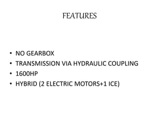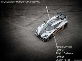 The document discusses the Koenigsegg direct drive system featuring no gearbox and transmission via hydraulic coupling. It highlights the system's 1600hp output and hybrid configuration with two electric motors and one internal combustion engine. Key advantages include wear-free power transmission, smooth acceleration, and shock damping.
