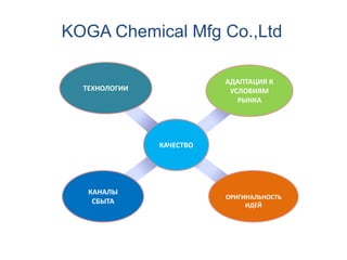 Документ содержит информацию о компании Koga Chemical Mfg Co., Ltd, включая ее историю, технологии и ассортимент продукции, такой как антифризы и присадки. Обсуждаются преимущества и недостатки различных типов антикоррозийных добавок, а также спецификации продукции, используемой автопроизводителями в Японии. Кроме того, упоминается вклад компании в снижение воздействия на окружающую среду за счёт разработки долгоживущих охлаждающих жидкостей.