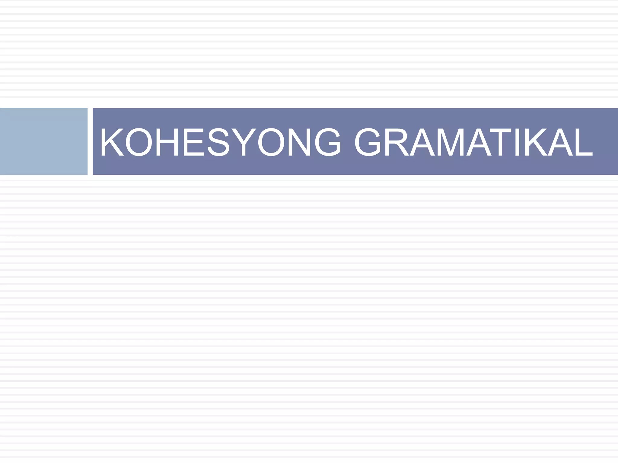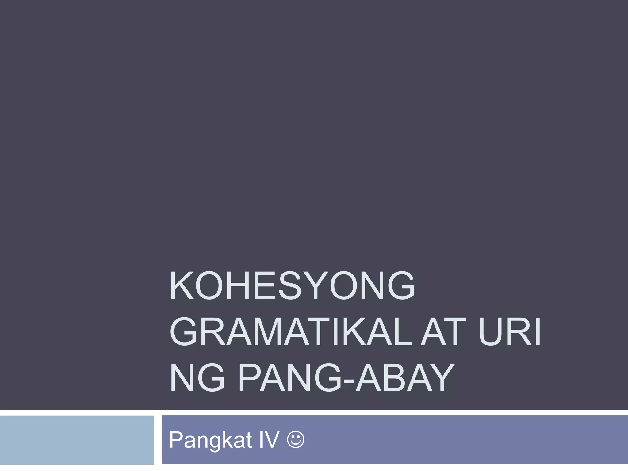 Ang dokumento ay tungkol sa kohesyong gramatikal at mga uri ng pang-abay. Tinalakay nito ang konsepto ng kohesyong gramatikal bilang mga salitang pumapalit upang maiwasan ang pag-uulit, kasama ang mga halimbawa ng anapora at katapora. Ang iba't ibang uri ng pang-abay ay isinama, na naglalarawan kung paano ito nagbibigay turing sa pandiwa, pang-uri, o kapwa pang-abay.
