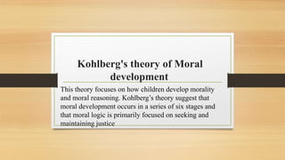 Kohlberg was an American psychologist known for his theory of moral development which consists of six stages across three levels - preconventional, conventional, and postconventional. The preconventional level includes the punishment and obedience orientation and instrumental purpose stages. The conventional level comprises the good boy-good girl and social order maintaining stages. Finally, the postconventional level contains the social contract orientation and universal ethical principle stages. Kohlberg believed that moral reasoning progresses through these stages as individuals develop their understanding of justice.