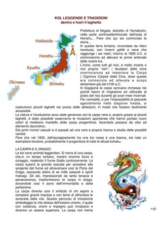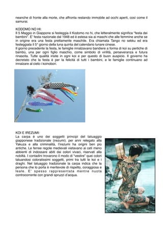 Il documento esplora le origini storiche e culturali delle koi, carpe ornamentali giapponesi, che furono allevate in Giappone dal 1600 d.C. e simbolizzano perseveranza e grandezza. Viene descritto anche il significato del Kodomo no Hi, la festa dei bambini che celebra queste carpe come simbolo di buona fortuna, e il ruolo della koi nell'irezumi, il tradizionale tatuaggio giapponese. Infine, il testo sottolinea l'importanza del giardino giapponese, un microcosmo di equilibrio e bellezza, dove ogni elemento, come l'acqua e le pietre, gioca un ruolo cruciale nella creazione di una percezione armoniosa della vita.