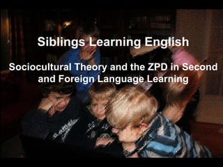 This document discusses how siblings can help each other learn English outside the classroom through sociocultural theory and the Zone of Proximal Development (ZPD). It examines the language learning experiences of children in one family, how they use language in different contexts, and how the ZPD applies to language learning within the family. The research methods used include nexus analysis, interviews, observations, and video recordings to analyze language learning among siblings in the home environment.