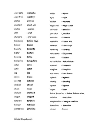 Dokumen ini berisi daftar istilah yang berkaitan dengan berbagai topik seperti perayaan, ilmu pengetahuan, dan pengangkutan. Beberapa istilah yang dicatat mencakup Aidil Adha, insurans, dan eksport. Tujuannya adalah untuk memberikan pemahaman lebih baik tentang istilah-istilah tersebut dalam konteks yang relevan.