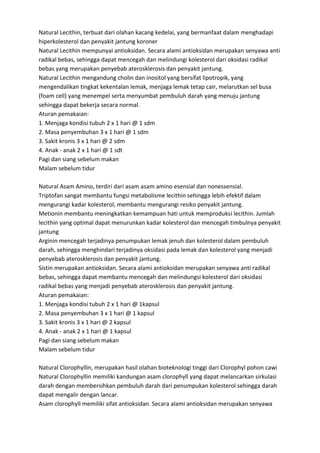 Dokumen tersebut membahas tentang hiperkolesterolemia atau kadar kolesterol tinggi dalam darah yang merupakan faktor risiko penyakit jantung koroner. Ia menjelaskan penyebab kolesterol tinggi serta produk-produk kesehatan alami dari NASA yang dapat membantu menurunkan kadar kolesterol dan meringankan penyakit jantung koroner.