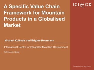 This document discusses a framework for mountain product value chains in a globalized market. [1] It notes the challenges and opportunities that socioeconomic and environmental changes present for mountain communities. [2] Mountain products provide important linkages between highland and lowland, rural and urban areas. [3] The value chain approach can help generate economic opportunities for mountain livelihoods by leveraging the comparative advantages of mountains, such as resource diversity and traditional knowledge.