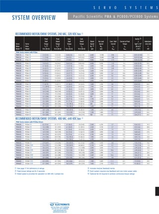 - Recommended motor/drive systems are listed, specifying key torque, speed, current, and inertia specifications to help selection of the optimal system. Systems cover a range of motor sizes from small