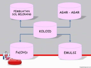 Dokumen tersebut membahas tentang koloid dan berbagai metode pembuatan koloid, termasuk kondensasi, dispersi, reaksi redoks, hidrolisis, dekomposisi rangkap, dan pergantian pelarut. Juga dibahas tentang emulsi, agar-agar, dan contoh pembuatan sol Fe(OH)3.