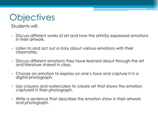 The document outlines a lesson plan using art, literature, drama, and creative expression to teach students about emotions. Over four days, students will view and discuss artworks depicting emotions, act out a story, take photos of themselves showing emotions, create art representing the emotions in their photos, and write descriptions of their artwork. The goal is for students to discuss different emotions, express themselves artistically, and enhance their understanding of emotions in others.