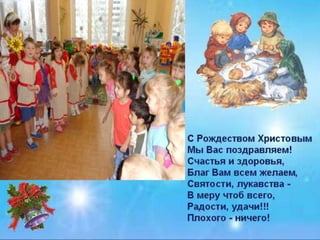 В документе описываются рождественские традиции, включая зажжение свечи и колядки, которые воспевают рождение Христово и других участников великой ночи. Упоминаются символы, такие как солнце на палке, которые символизируют добро и здоровье. Документ подчеркивает важность празднования и радости, связанные с Рождеством.