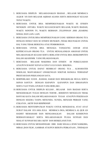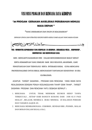 Dokumen ini merupakan visi dan misi dari Juli Wantoro yang mencakup 38 program gerakan akselerasi perubahan menuju masa depan. Tujuannya adalah membentuk kepribadian yang berakhlak mulia dan berprestasi, serta mencapai profesionalisme dalam pendidikan dan kehidupan sosial. Dengan berkomitmen untuk menghindari keburukan dan selalu berdoa, ia berusaha memberikan manfaat bagi orang tua, masyarakat, dan bangsa.