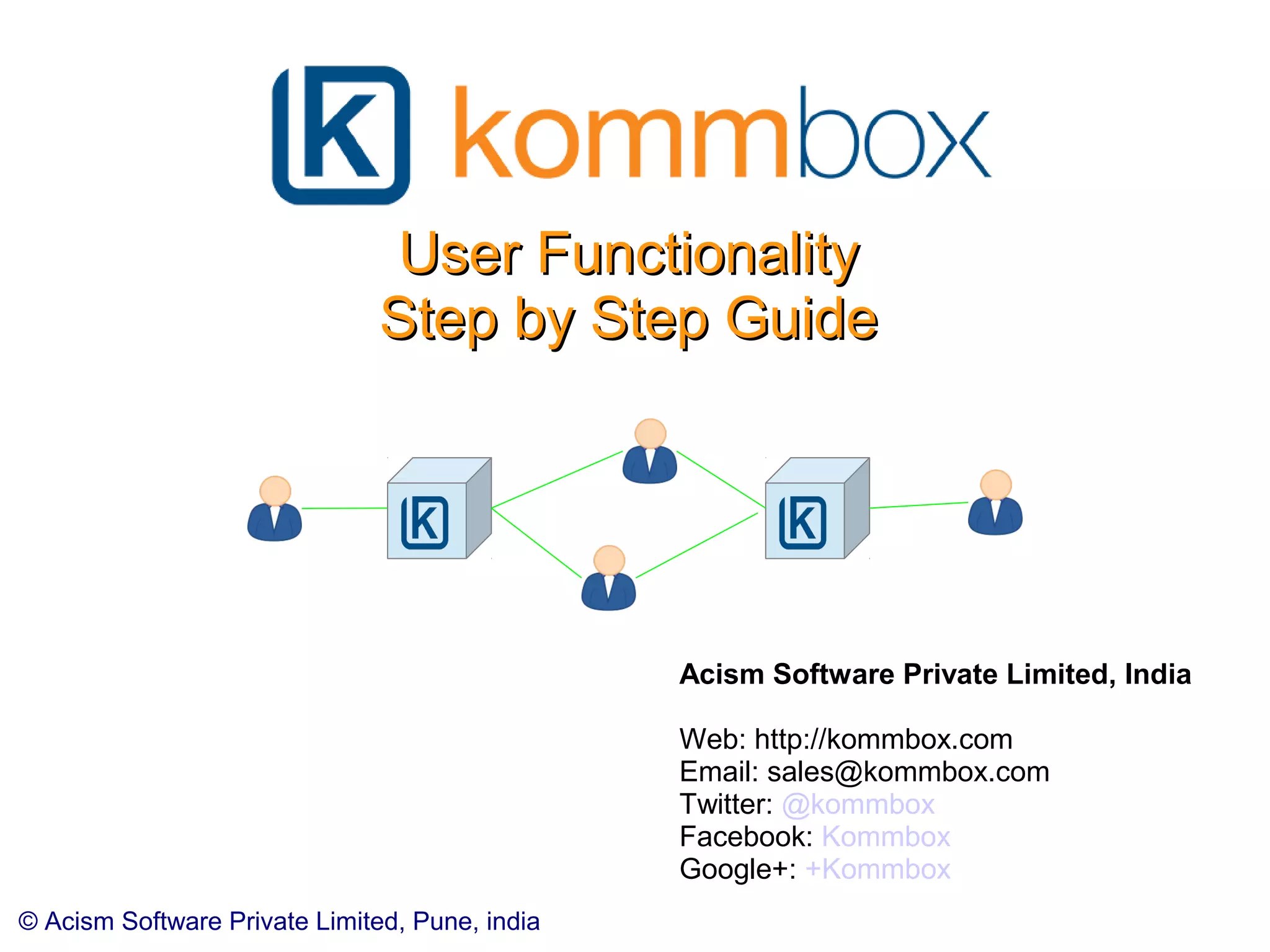 The document provides a step-by-step guide for users of Kommbox, detailing the process of account activation, login, and navigation through the dashboard. It covers creating discussions and tasks, managing replies, viewing tasks, and utilizing features like two-way email integration and profile management. Additional functionalities such as reporting issues, referring contacts, and analytics summaries for user activity are also mentioned.
