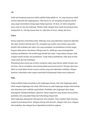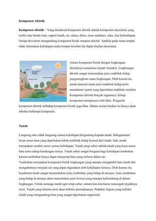 Komponen abiotik ekosistem terdiri atas benda mati seperti tanah, air, udara, iklim, cahaya matahari, suhu, dan kelembapan. Komponen-komponen ini saling berinteraksi dan mempengaruhi jenis makhluk hidup yang dapat hidup. Contohnya, kesuburan tanah menentukan jenis tumbuhan, sedangkan jenis tumbuhan menentukan jenis hewan. Komponen-komponen ini juga penting bagi kelangsun