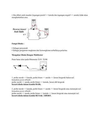 Dioda adalah komponen elektronik yang terbuat dari bahan semikonduktor seperti silikon atau germanium yang hanya mengizinkan arus listrik mengalir searah. Dioda digunakan dalam berbagai aplikasi seperti penyearah, pengaman, indikator, dan lainnya.