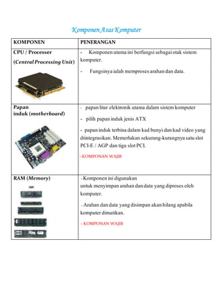 Dokumen ini menjelaskan berbagai komponen utama dalam sistem komputer, termasuk CPU, motherboard, RAM, dan penyimpanan seperti hard disk dan CD/DVD drive. Setiap komponen memiliki fungsi spesifik, seperti memproses data, menyimpan informasi, dan memberikan output. Selain itu, terdapat komponen pilihan seperti modem dan web camera untuk kebutuhan tambahan.