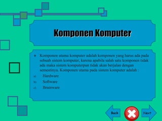 Dokumen ini menjelaskan komponen utama komputer, termasuk hardware, software, dan brainware, serta fungsi masing-masing komponen. Jenis perangkat keras dijelaskan secara rinci, termasuk mouse, keyboard, printer, dan lainnya, bersama dengan peran penting perangkat lunak dalam mengoperasikan komponen-komponen tersebut. Selain itu, juga diuraikan tentang berbagai tipe software seperti sistem operasi, program utility, dan bahasa pemrograman.