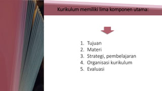 Dokumen tersebut membahas lima komponen utama kurikulum yaitu tujuan, materi pembelajaran, strategi pembelajaran, organisasi kurikulum, dan evaluasi. Komponen-komponen tersebut merupakan unsur penting dalam pengembangan dan pelaksanaan kurikulum pendidikan.