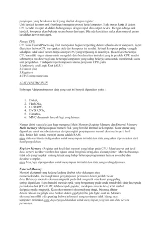 Dokumen ini menjelaskan komponen pokok hardware komputer, yang terdiri dari alat input, proses, penyimpanan, output, dan komunikasi. Fokus utama terdapat pada CPU sebagai unit pengolah pusat yang mengolah data berdasarkan instruksi dan terdiri dari beberapa komponen seperti unit kendali dan aritmetika logika. Selain itu, dibahas mengenai berbagai jenis alat penyimpanan data, termasuk memori utama, register, dan memori eksternal.