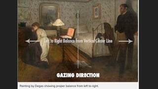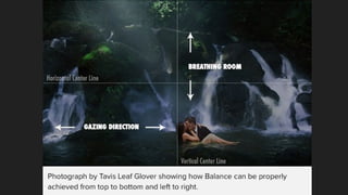 The document discusses the composition in photography, specifically addressing how to arrange various elements within a photo frame. It explores concepts from gestalt psychology such as figure/ground and principles like symmetry and balance to create visual coherence. Key quotes from notable figures highlight the importance of structure and organization in achieving effective composition.