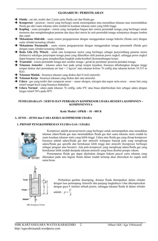Dokumen ini menjelaskan tentang kompresor udara, jenis-jenisnya, cara kerja, dan pemanfaatan udara bertekanan. Kompresor berfungsi untuk memampatkan fluida gas dari tekanan rendah ke tekanan tinggi dan dapat dibedakan menjadi beberapa jenis serta klasifikasi berdasarkan cara pemampatan, tingkat kompresi, serta aplikasinya. Selain itu, disertakan juga komponen utama kompresor seperti silinder, torak, dan katup-katup yang penting dalam proses kompresi.