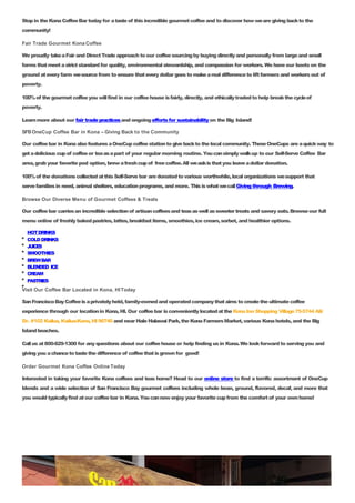 The Kona Coffee Bar offers high-quality gourmet coffees sourced through a fair and direct trade approach, supporting local farmers and the community. Located in Kailua-Kona, the coffee house features a relaxing atmosphere, a diverse menu of sweet and savory options, and a unique self-serve coffee station that allows donations to local organizations. The coffee bar aims to provide an authentic Kona coffee experience while giving back to the community and preserving the region's rich coffee farming tradition.