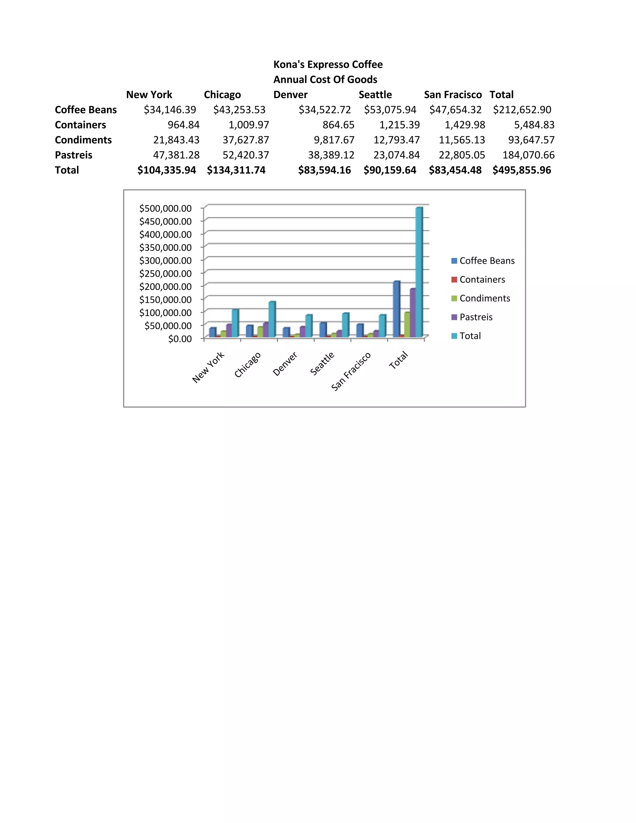 The document shows the annual cost of goods for Kona's Expresso Coffee across 5 cities. Coffee beans were the largest expense totaling over $212,000. Chicago had the highest total annual cost of goods at $134,311.74 while Denver had the lowest at $83,594.16.