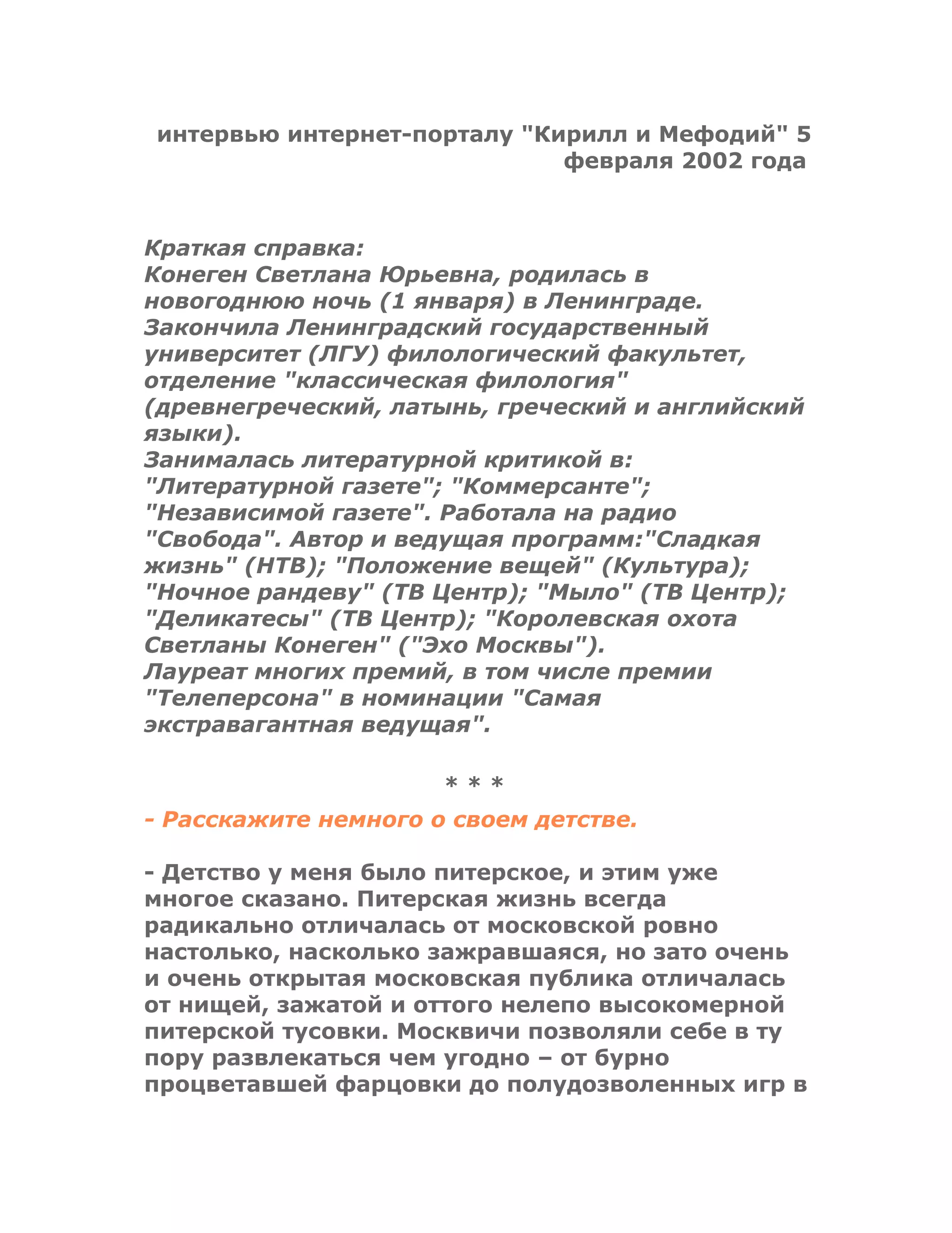 Светлана Конеген, родившаяся в Ленинграде, является известным филологом, литературным критиком и телеведущей, работающей на различных эфирных платформах. В интервью она делится воспоминаниями о своем детстве, обучении и карьерном пути, включая заметки о культурной среде Петербурга и Москвы, а также о влиянии своих программ на телевидение. Конеген подчеркивает важность ироничного и свободного подхода к медийному контенту и обсуждает свои планы на будущее в свете меняющейся политической ситуации.