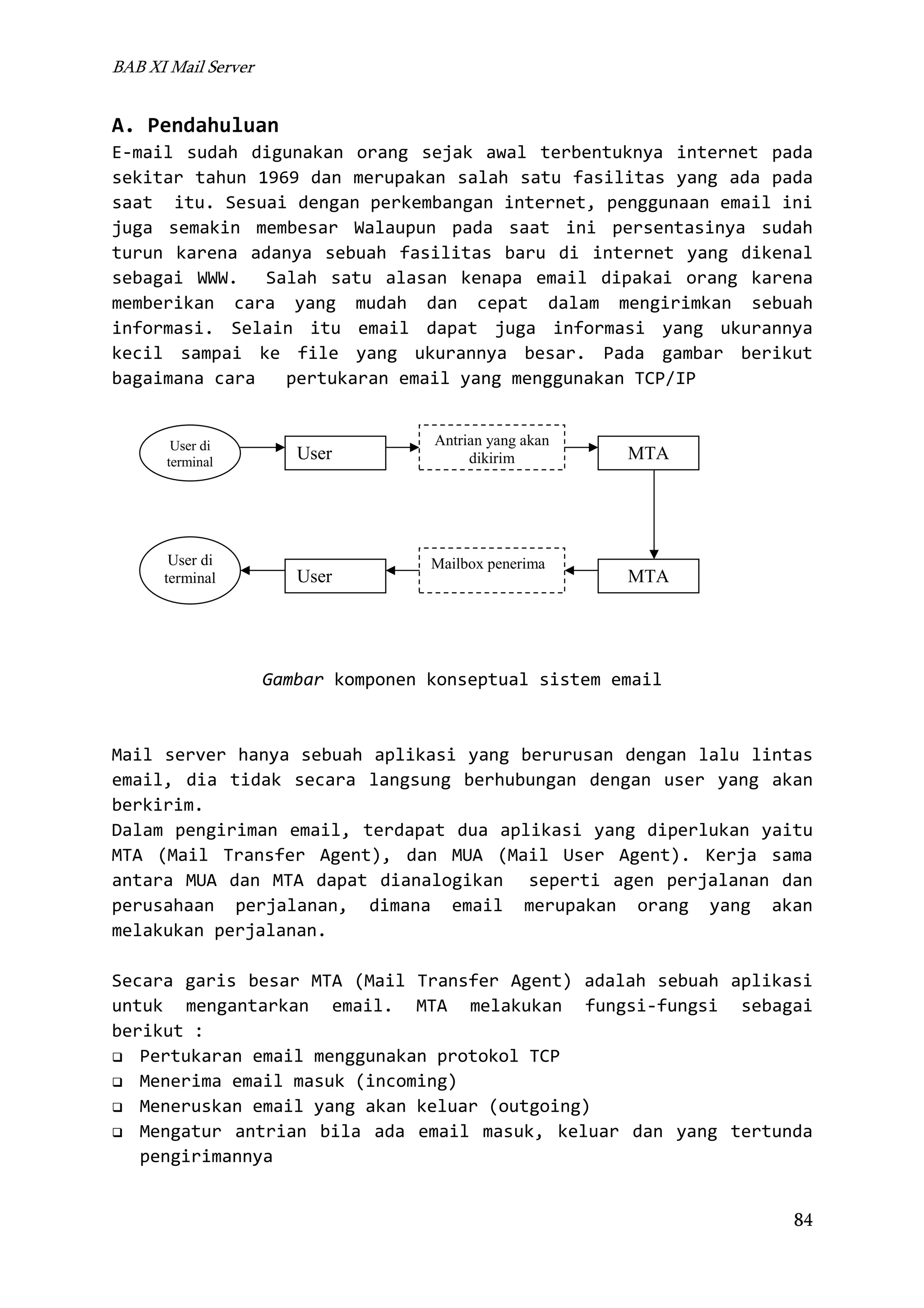 Dokumen tersebut membahas tentang konfigurasi mail server pada Debian 4 menggunakan postfix, courier-pop, dan courier-imap. Terdapat penjelasan mengenai komponen-komponen email seperti MTA, MUA, envelope, header, dan body. Juga dijelaskan tentang instalasi dan konfigurasi mail server, pembentukan user, serta penggunaan webmail Squirrelmail.