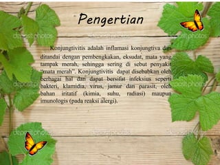 Konjungtivitis adalah inflamasi konjungtiva yang dapat disebabkan oleh infeksi, iritasi, atau reaksi alergi, ditandai dengan gejala seperti mata merah, gatal, dan eksudat. Penatalaksanaan termasuk penggunaan tetes mata antibiotik dan kompres hangat, serta pengkajian mata untuk mendeteksi infeksi dan komplikasi. Terdapat berbagai tipe konjungtivitis, termasuk alergi, viral, dan bakteri, dengan risiko penularan yang perlu dicegah melalui praktik kebersihan.