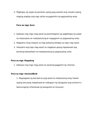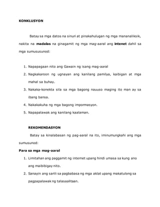 Batay sa pagsusuri, madalas gamitin ng mga mag-aaral ang internet para sa mga kadahilanang tulad ng pagpapadali ng gawain at pakikisalamuha. Iminumungkahi ang paghihigpit sa paggamit ng internet at ang pagbibigay ng oras para sa pagbabasa ng mga aklat. Rekomendasyon din ang gabayan ang mga mag-aaral sa tamang paggamit ng internet at hikayatin silang magbasa nang mas marami.