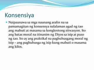 Ang dokumento ay naglalahad ng mga panloob na salik na nakakaapekto sa paghubog ng pagpapahalaga at konsensiya ng isang tao, na nagsisilbing batas moral na itinanim ng Diyos. Sinasalamin nito ang kahalagahan ng edukasyon sa konsensiya ng mga bata, lalo na sa tulong ng mga magulang at guro. Nagbigay din ito ng halimbawa ng mga positibong kilos na naipapakita ng mga bata na nagpapakita ng kanilang pagkakaunawa sa mabuti at masama.