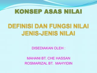 Dokumen ini membahas definisi, tujuan, dan kepentingan nilai dalam kehidupan manusia, dengan beragam pandangan dari tokoh-tokoh serta perbedaan antara perspektif Barat dan Islam. Nilai berfungsi sebagai panduan dalam tindakan, menjaga peraturan, dan membentuk etika masyarakat. Selain itu, dokumen juga menyentuh tentang kurangnya amalan positif dalam masyarakat saat ini.