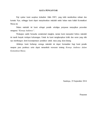 Makalah ini membahas 'konsep audience' dalam komunikasi massa, mendefinisikan audiens sebagai sekumpulan orang yang membaca, mendengar, dan menonton media. Dokumen ini juga menjelaskan karakteristik dan peran audiens, serta bagaimana media membentuk audiens berdasarkan berbagai faktor sosial. Tujuannya adalah untuk meningkatkan pemahaman tentang pengertian, karakteristik, dan konsep audiens dalam konteks komunikasi massa.
