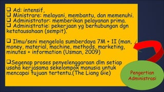 Dokumen ini membahas prinsip dan fungsi administrasi pendidikan, termasuk definisi, perencanaan, dan pengelolaan sumber daya dalam konteks pendidikan. Fokus utama adalah pada tujuan administrasi pendidikan untuk mengembangkan potensi siswa dan meningkatkan kualitas pendidikan melalui berbagai kegiatan yang melibatkan banyak pihak. Terdapat pula perbedaan antara administrasi dan manajemen serta peran masing-masing dalam lembaga pendidikan.