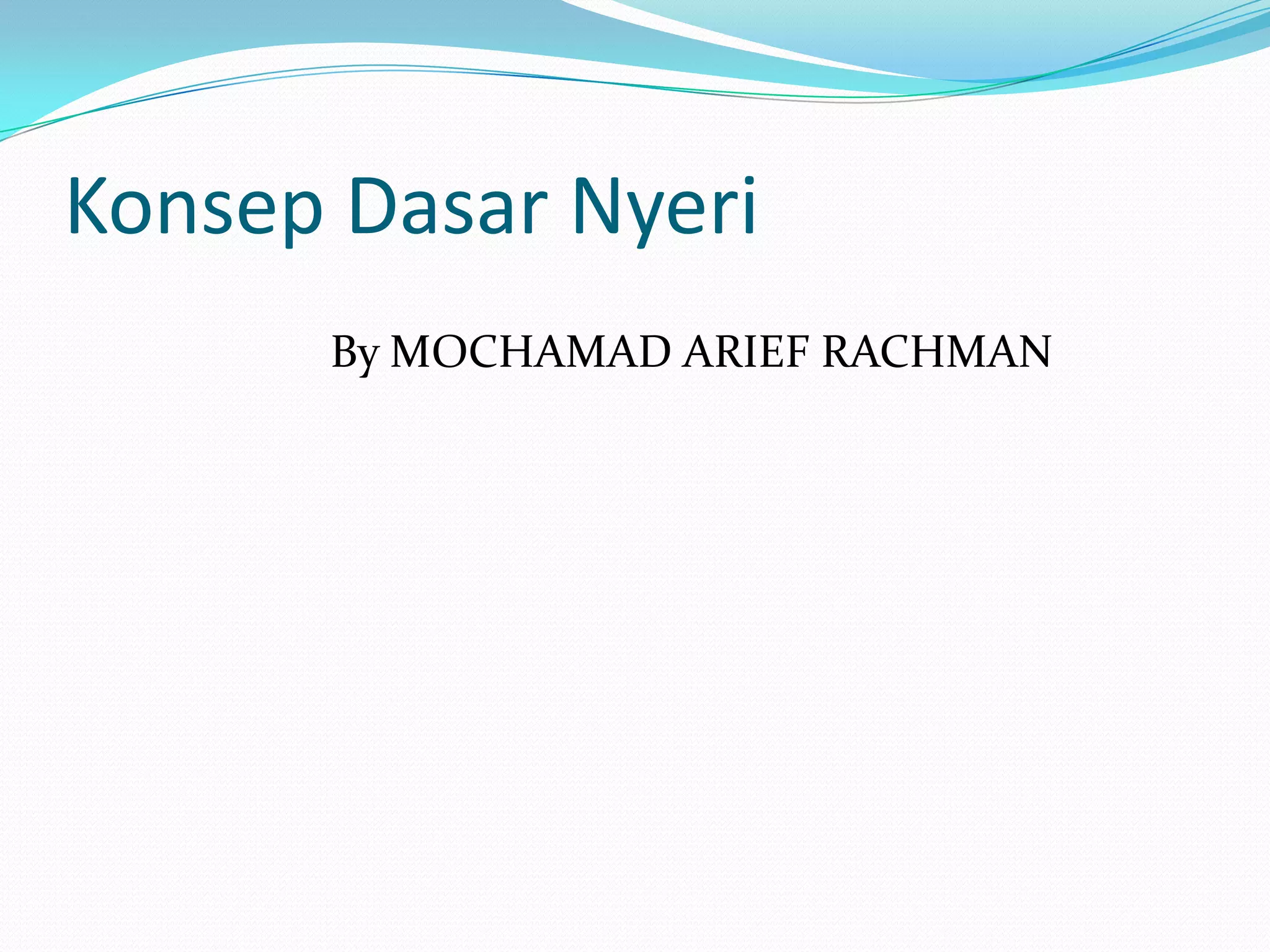 Konsep dasar nyeri membahas pengertian nyeri sebagai perasaan tidak nyaman yang subyektif dan hanya dapat dijelaskan oleh yang mengalaminya. Nyeri ditransmisikan melalui serat saraf ke otak dan dipengaruhi pengalaman individu, presepsi, serta toleransi terhadap intensitas nyeri. Ada dua jenis nyeri, yaitu nyeri perifer dan sentral, serta dua bentuk nyeri, yaitu akut dan kronis. Skala nyeri