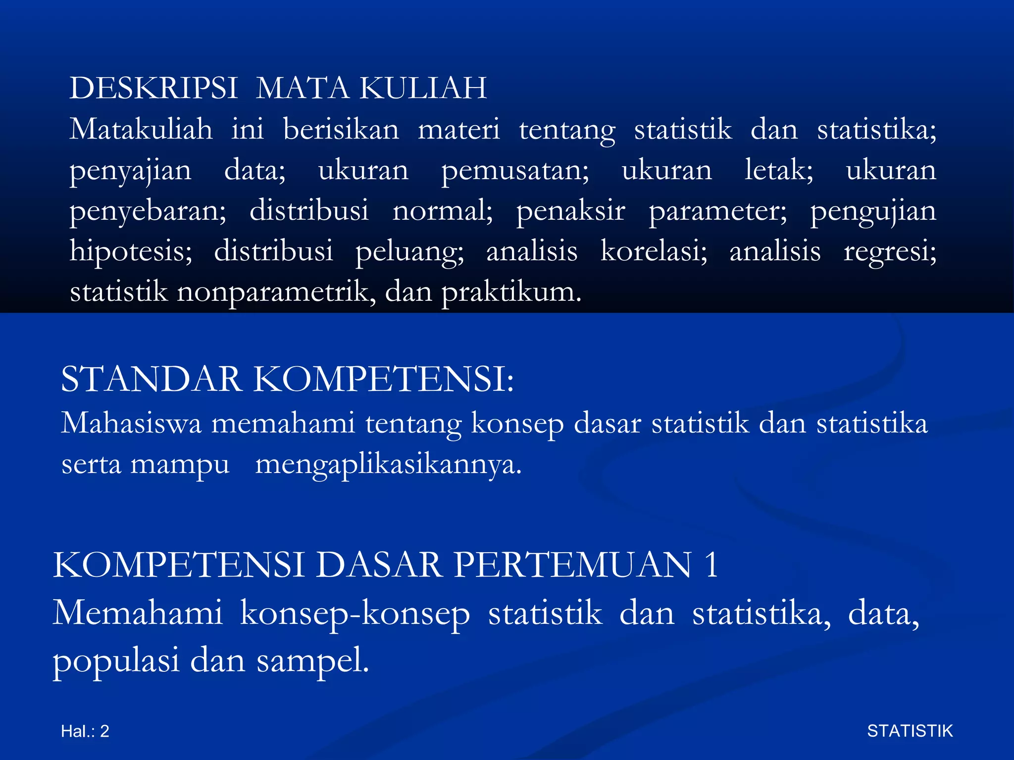 Dokumen tersebut membahas tentang konsep dasar statistika dan statistika. Materi utama mata kuliah statistika mencakup penyajian data, ukuran pemusatan, distribusi normal, dan analisis regresi. Dokumen ini juga menjelaskan pengertian statistika, tujuan statistik, dan contoh-contoh penerapannya dalam berbagai bidang."