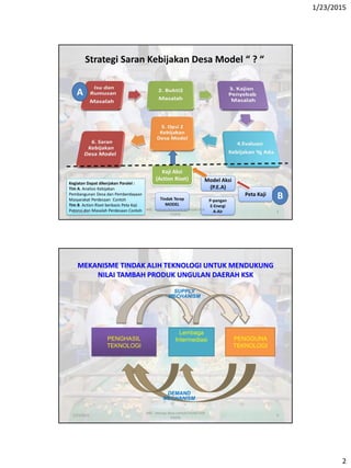 Dokumen ini membahas pengembangan desa model KSK dalam konteks PNPM PISEW dengan fokus pada inovasi dan peningkatan produk unggulan daerah. Terdapat analisis potensi sumber daya alam, mekanisme pengalihan teknologi, dan strategi kebijakan untuk pemberdayaan masyarakat perdesaan. Pendekatan kluster industri dan model aksi riset juga diusulkan untuk meningkatkan nilai tambah produk.