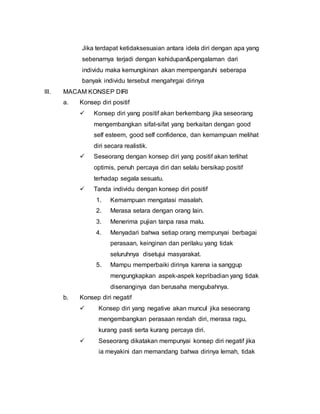 Dokumen tersebut membahas tentang konsep diri, yang didefinisikan sebagai gambaran seseorang tentang dirinya sendiri. Terdiri dari beberapa komponen seperti identitas, peran, citra diri, harga diri, dan ideal diri. Konsep diri dapat berupa positif atau negatif, terbentuk sejak dini dan dipengaruhi faktor seperti usia, intelijen, pendidikan, status sosial ekonomi, dan hubungan keluarga. Proses keperaw