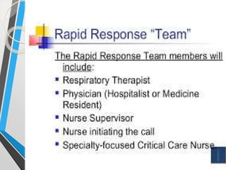 EWS digunakan untuk mendeteksi dini pasien yang memburuk melalui pengukuran parameter fisiologis. Skor EWS ditentukan dari beberapa parameter dan mengindikasikan tingkat respons yang dibutuhkan, dari meningkatkan observasi hingga tim medis cepat. Tim medis cepat dilatih untuk mengidentifikasi gejala sebelum komplikasi serius dan memberikan tindakan penyelamatan dalam waktu 5 menit.