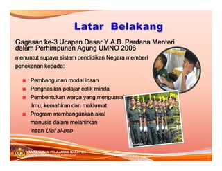 Dokumen ini membahas langkah-langkah untuk memperbaiki kurikulum pendidikan Malaysia melalui pengembangan modal insan yang seimbang dan holistik. Penekanannya adalah pada pengajaran nilai-nilai murni, kemahiran abad ke-21, serta kreativiti dan teknologi dalam pendidikan. Transformasi kurikulum memerlukan kerjasama dari semua pihak termasuk guru dan orang tua untuk memastikan pendidikan yang relevan dan berkualiti.