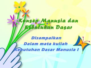 Dokumen ini membahas konsep manusia dan kebutuhan dasar yang terintegrasi dalam layanan keperawatan, yang mencakup aspek bio-psiko-sosio-spiritual. Kebutuhan dasar manusia dibedakan menjadi unsur yang beragam dipengaruhi oleh faktor budaya dan kondisi individu, serta hierarki kebutuhan menurut Abraham Maslow, yang menyatakan setiap orang memerlukan pemenuhan kebutuhan fisiologis sebelum kebutuhan yang lebih tinggi. Interaksi dan hubungan keluarga juga berperan penting dalam pemenuhan kebutuhan dasar manusia.