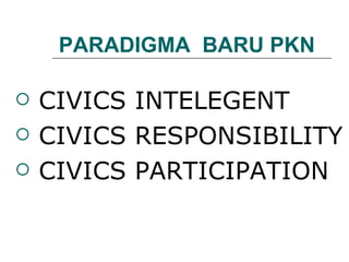 Dokumen ini membahas pentingnya konsep, nilai, norma, dan moral dalam pendidikan kewarganegaraan (PKN) sebagai panduan untuk membentuk sikap dan tingkah laku yang baik di masyarakat. Ditekankan bahwa nilai-nilai tersebut harus diinternalisasi dalam diri individu agar menjadi norma yang memengaruhi perilaku sehari-hari. Selain itu, pendidikan moral juga diperlukan untuk membentuk karakter dan kesadaran individu dalam menjalani kehidupan bermasyarakat yang demokratis.