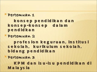 Konsep pendidikan dan profesi keguruan dibahas dalam tiga pertemuan yang membahas konsep-konsep pendidikan, profesi keguruan, dan isu-isu pendidikan di Malaysia. Dokumen ini juga membahas definisi pendidikan menurut beberapa ahli pendidikan dan membandingkan konsep pendidikan dan latihan.
